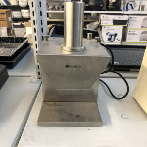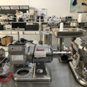 Struttura in alluminio lucidato con tramoggia in acciaio inox – gruppo di macinazione inox AISI 304 completamente removibile che permette di poterlo collocare in frigorifero – bocca ingresso carne diam. 52 mm – riduttore con ingranaggi a bagno d’olio – in dotazione sistema enterprise con piastra inox (fori diam. 6 mm) e coltello inox autoaffilante. La parte della grattugia è caratterizzata da: bocca in alluminio lucidato 140×75 mm – rullo in acciaio inox – griglia inferiore di protezione – microinterruttore leva pressore grattugia.