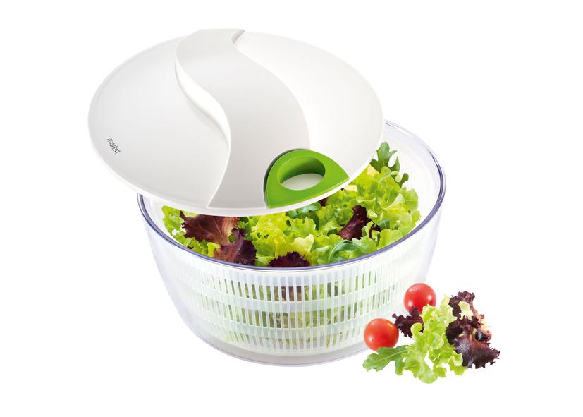 CENTRIFUGA INSALATA ‘TURBY’ BIANCO Ø24CM MOHA: Centrifuga per insalata TURBY. contenitore in materiale sintetico, con coperchio bianco. Cambio di direzione automatico ad ogni azionamento. La forma del coperchio è stata sviluppata per l’uso di persone mancine e destrorse. Il cestello è utilizzabile anche come colatutto. Lavabile in lavastoviglie. Misure: h 16cm – Ø 24cm Materiali: ABS, PP, SAN. Brevetto Moha.